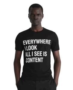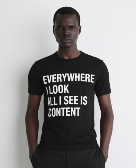 BASIC BLACK T-SHIRT WITH WHITE LETTERING: EVERYWHERE I LOOK, ALL I SEE IS CONTENT